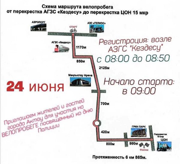 Победителя ждет велосипед в подарок и ценные призы! Уважаемые жители и гости Мангистау! Мы рады сообщить Вам, что 24 июня в 09:00 часов с участием акима области Е. Тугжанова будет дан старт долгожданному вело пробегу. Данное мероприятие проводиться в рамках программы «Рухани жаңғыру», к Международному Олимпийскому дню, к 20-летию столицы Астаны, а так же ко дню Казахстанской полиции. Приглашаем всех желающих принять участие в данном мероприятии. Маршрут от перекрестка АГЗС «Кездесу» до перекрестка ЦОН 15 мкр. Регистрация: возле АГЗС «Кездесу» с 08:00 до 08:50